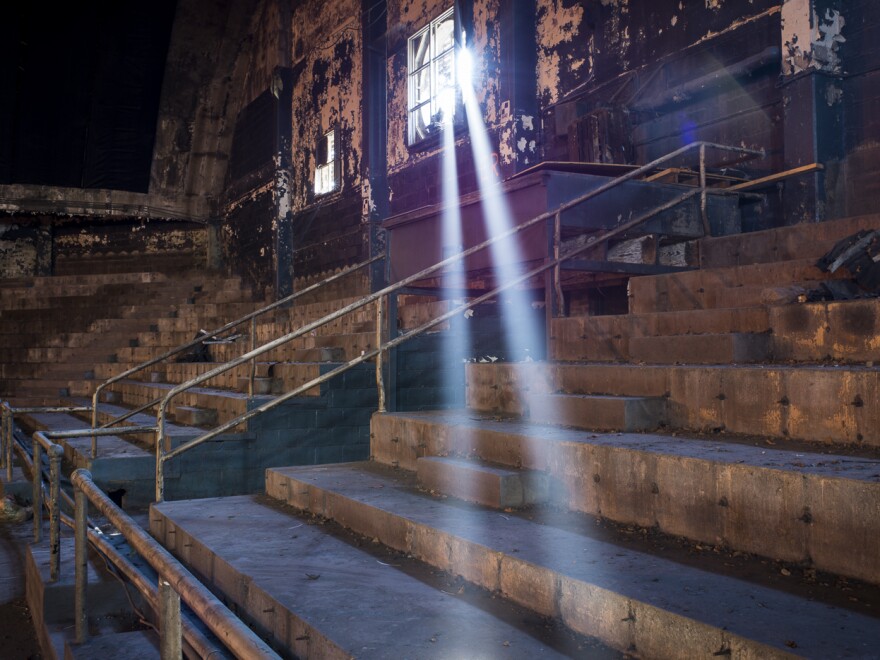 Still, on any given day, beautiful shafts of light can been seen spilling through the circular windows in the vaulted ceilings onto the abandoned clusters of stadium seating lurking in dark corners along the walls.