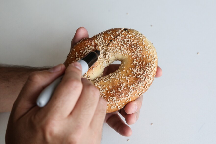 The line needs to wrap around the outside and inside of the bagel, and end up connecting to the beginning. Then slice along the line using a small, nimble knife.
