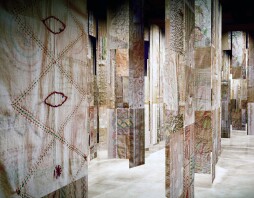 25 Million Stitches: One Stitch, One Refugee amasses 25 million stitches—portraying the number of refugees displaced from their homelands across the world—on 14 foot-long muslin embroidered flags filling 4,000 square feet of exhibition space at Coconino Center for the Arts. The project was launched by artist Jennifer Kim Sohn as a global, participatory art project to address the vast crisis of worldwide displacement. The concept was simple: one stitch of embroidery for each refugee. The project provides a beautifully resonant expression of art activism that raises awareness of the immense scope of people forcibly displaced from their homelands by violence and natural disasters. Since the medium involved basic stitching, the project was able to attract a very diverse group of participants from 36 countries and from every state in the United States. The culmination of this global community effort resulted in a grand tapestry rich with images, symbols and messages of solidarity, hope and community all of which give the viewer a textural way to process and experience the enormity of 25 million people, the number the United Nations High Commissioner for Refugee (UNHCR) estimated were refugees when the project commenced in May of 2019. By comparison, the most recent estimate in June 2022 has grown to 27 million refugees worldwide.