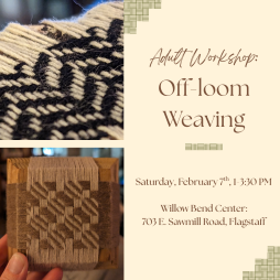After a brief overview of the history of weaving both on and off-loom, Jessica will guide all attendees through the same pattern to get everyone acquainted with this new skill. Each participant will learn how to begin their pattern on a 5-inch by 5-inch piece of wood (without pegs or grooves), using a tapestry needle for the shuttle. Along the way, participants will be introduced to the mental health benefits of weaving.