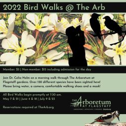 Join Dr. Celia Holm on a morning walk through The Arboretum at Flagstaff gardens. Over 130 different species have been sighted here! Please bring water, a camera, comfortable walking shoes and a mask!