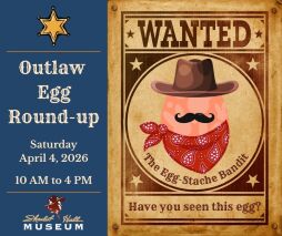 Saddle up, partners! A band of mischievous outlaw eggs have scattered themselves all over the Museum. Your mission: jot down where each egg is hiding. Keep your eyes sharp and see if you’ve got what it takes to be the quickest egg-wranglin’ detective in the West. When you’ve found them all, mosey on over to the gift shop and turn in your roundup sheet to claim your reward.