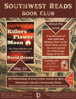 Pick up a copy of this month's book from the Downtown Library Information Desk. The Killers of the Flower Moon is also available as an ebook and an e-audiobook on Libby, and as an audio CD.