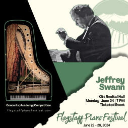 During his residency at Flagstaff Piano Festival, Jeffrey Swann will also teach a public piano masterclass on Tuesday, June 25, 2024 at 10:00AM-12:00PM in Kitt Recital Hall. Admission to the masterclass is free.