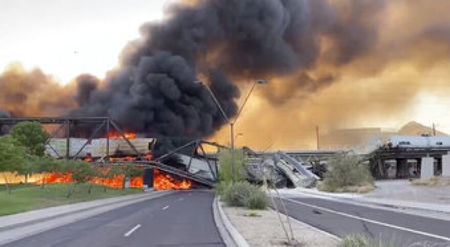 Officials say a freight train traveling on a bridge that spans Tempe Town Lake in metro Phoenix has derailed, setting the bridge on fire and partially collapsing the structure.